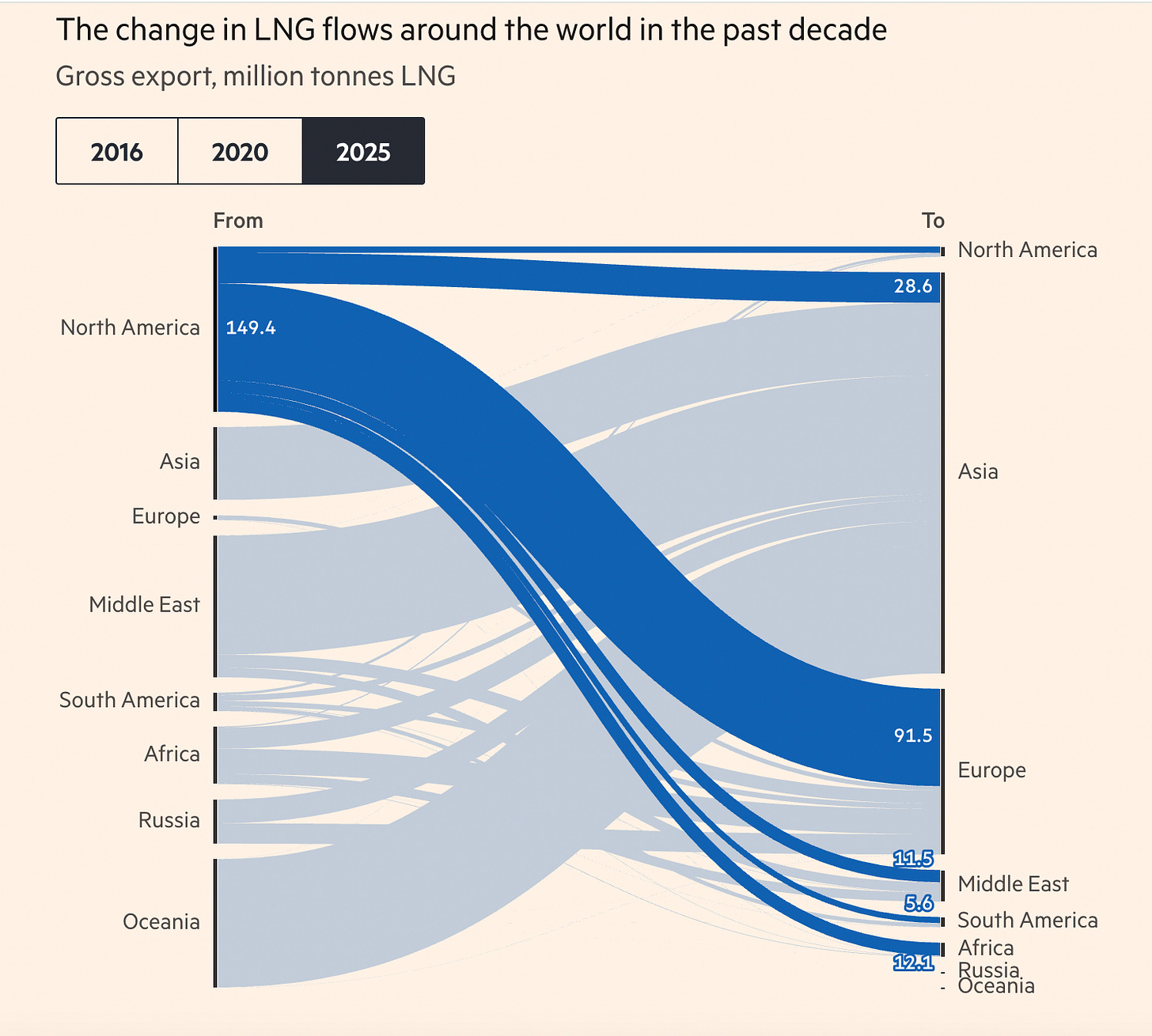 A decade ago, Europe imported almost no oil and gas from the US. Today, the European Union gets roughly half of its LNG from American exporters, alongside a growing share of crude and refined products, at a price premium, of course. This is one of the fastest energy realignments in modern history. It was not planned so much as forced. First Russia’s invasion of Ukraine, now a war leading to the closure of Hormuz. Each shock closes off one set of dependencies and pushes Europe deeper into another, throwing sand in the cogs of its once impressive manufacturing might.