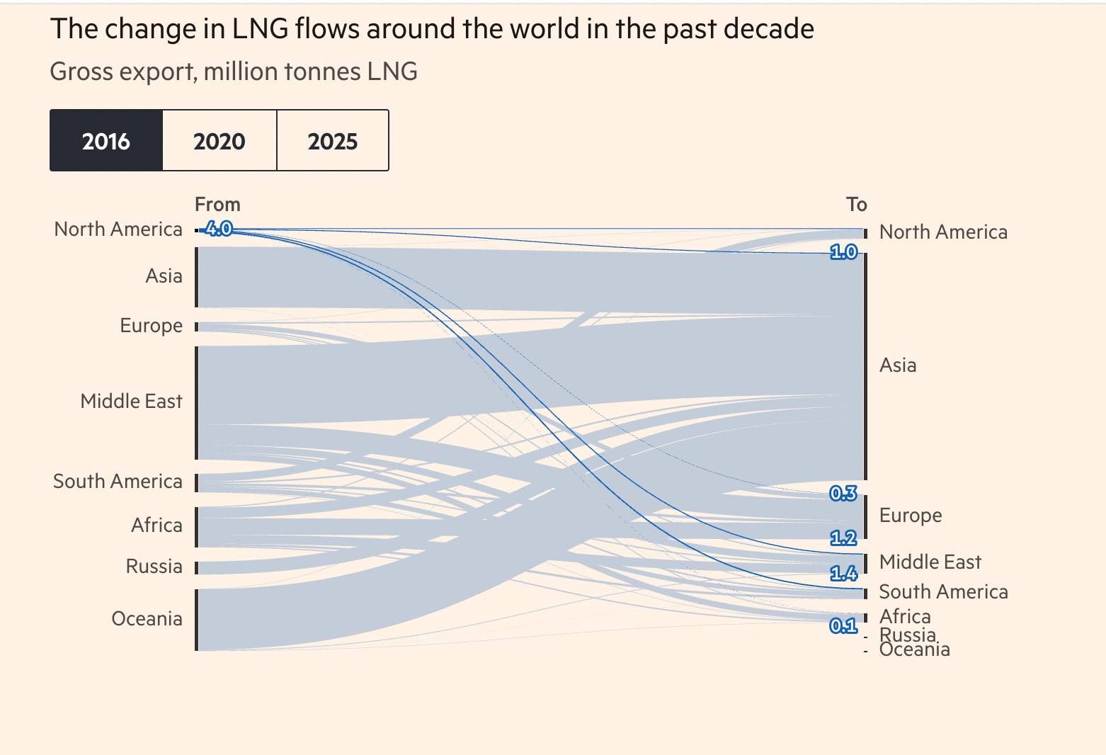 This is what political economists call weaponized interdependence. The system remains interconnected, but the nodes are not equal. Some actors gain the capacity to set terms, to condition access, to turn flows into leverage. Liquefied natural gas, once framed as a flexible commodity, begins to function as a strategic asset embedded in geopolitical relationships that are US-centric in part because they are fossil energy centric.